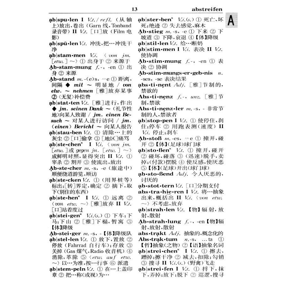 本书典收约31000个,内含我国《大学德语教学大纲》所规定的3500词,其中的2200词也是德国《对外德语测试大纲》所规定的现代德语基本词汇。近年来出现的常见的新词和新义、重要的科技术语及常用缩写词,也在本词典中得到一定程度的反映,除了现代标准德语的语外,本词典也不偏废虽为旧时习用但在现今出版物中仍然较为常见的词语,同时也酌量收录虽为地区性的但仍被广泛认同和使用的词语。奥地利和瑞士的特殊用语也有所顾及。